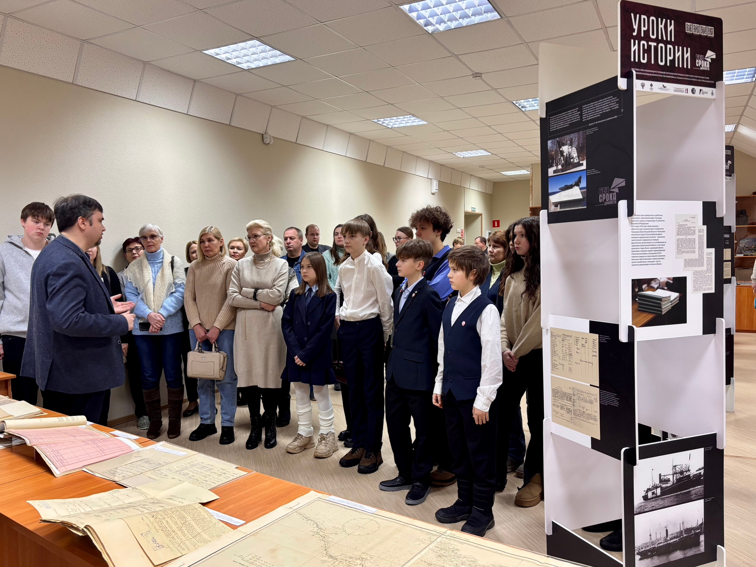 На презентации «Уроков истории» собрались архивисты, школьники и любители истории. Председатель регионального отделения Совета Российского военно-исторического общества и координатор проекта «Без срока давности» в Архангельской области А.В. Буглак поприветствовал гостей, рассказал об идее создания выставки и отметил ее высокую востребованность среди образовательных организаций.